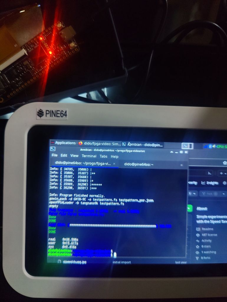 Next thing I tried was the Sipeed Tang Nano 9k FPGA. This proved to be the cheapest FPGA I could find and also the easiest to use and I’d been using it to learn Verilog. There turns out to be an ARM64 build of the OSS CAD Suite that runs fine on the Stormdeck, though it takes nearly ten minutes to build the FPGA video test I wrote which generates the SMTPE colour bars and other test patterns on a small 480×272 40-pin display. The Tang Nano 9k seems to be rather picky with USB ports and cables. It doesn’t like the USB hub I have and plugging it in straight it into the second USB port it gets detected enough to be able to upload a synthesized bitstream but it malfunctions like it doesn’t get enough power. I switched the internal jumper to power the USB ports from the 5V supply rather than battery and that seems to have gotten it to work but it means that I can’t use USB at all unless the Deck is plugged in. That’s obviously no good. I’ll probably need to use a more expensive powered USB hub instead of the very cheap one I’m using now.
