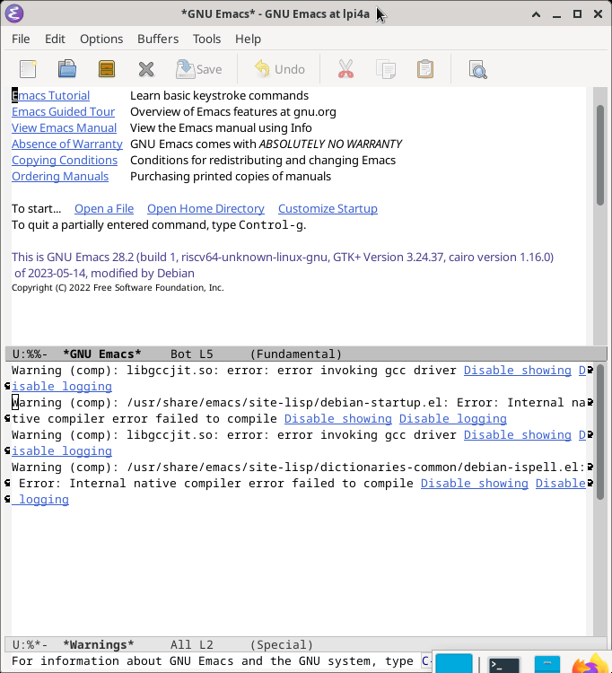 This was something that used to work just fine with the previous version of Emacs they used to install, but now I get this kind of garbage. Emacs seems to be trying to native compile all of the elisp files and of course it doesn’t work on RISC-V. It doesn’t look like there is a way to disable native compile if Emacs has been built with it. Since RevyOS doesn’t seem to include deb-src packages it looks like it is going to be a mess to build from source to exclude. Looks like I’m just going to have to disable logging and hope for the best.