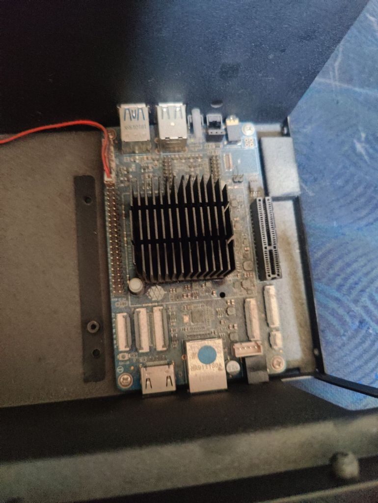 Akiha’s motherboard, a RockPro64, had five years’ worth of dust on it. I used one of those canisters of compressed air to blow away most of the dust and then an alcohol-based contact cleaner in spots to clean off the rest.